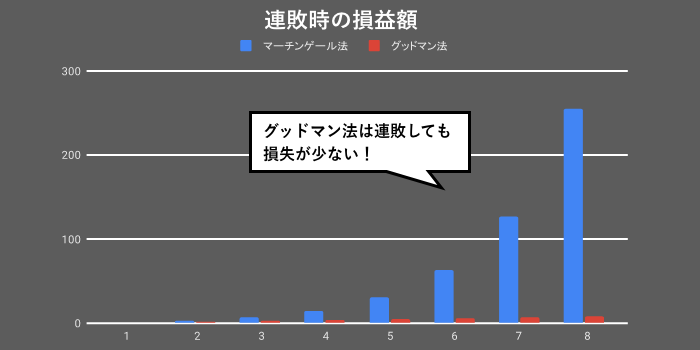 グッドマン法は連勝できない場合でも、損失はスタート賭け金分だけで済むので、連敗しても損失が抑えられます。