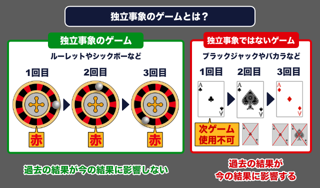 一方、バカラやブラックジャックはシューに残っているカード次第でゲーム結果に偏りが出るため、独立事象のゲームではありません。