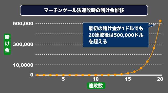 20連敗時の損失額は$104,8575です。20連敗できるほどの資金力がある人でも資金力次第では30連敗、40連敗には耐えられないでしょう。この連敗時の損失額とベット額の増加し具合こそ、マーチンゲール法が危険だといわれる理由です。