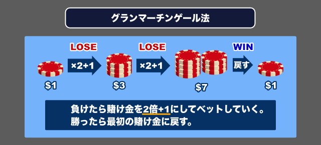 具体的にはマーチンゲール法は前ゲーム賭け金の2倍をベットしますが、この2倍を3倍に変えたり、2倍+1単位に変えるのです。3倍に変えるのを3倍マーチンゲール法、2倍+1単位に変えるのをグランマーチンゲール法ともいいます。