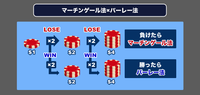 そこで提案したいのが、パーレー法と組み合わせての使用です。パーレー法は連勝時に倍賭けしていく手法で、逆マーチンゲール法ともいわれています。